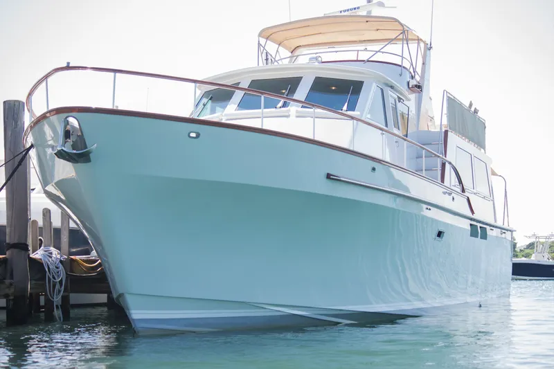The Deep-Vee hull is light gray with double dark blue boot tops and a red bottom. The transom is varnished teak (over fiberglass). The cabin house, fly bridge etc. is all awlgriped. Fiberglass Airex foam cored hull with bronze thru-hull fittings. Fiberglass decks and house with full thickness teak overlay in cockpit and on forward and side decks all of which are in excellent condition and show little wear. The flying bridge has an awlgripped deck with slight contrast in the non-skid areas. The transom has a full width teak overlay. The entire hull, and house etc. were re-awlgripped in 2018. The stern was done in clear awlgrip at that time.