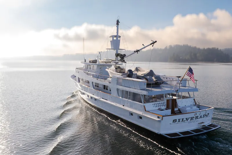 SILVERADO, the 1974 Willard 120-foot motor yacht is a timeless classic built by Willard Boat Works, currently located in Poulsbo, Washington. This elegant GRP-hulled vessel features an enduring profile with exterior design by John Harris and was crafted for comfortable long-range cruising. She is powered by twin Caterpillar diesel engines, offering a cruising speed around 12 knots and a top speed near 17 knots with an impressive range of roughly 3,500 nautical miles. Accommodations are thoughtfully laid out to host up to 10 guests in five suites, supported by crew quarters for up to six, making her a spacious and seaworthy yacht that blends vintage charm with practical capability.