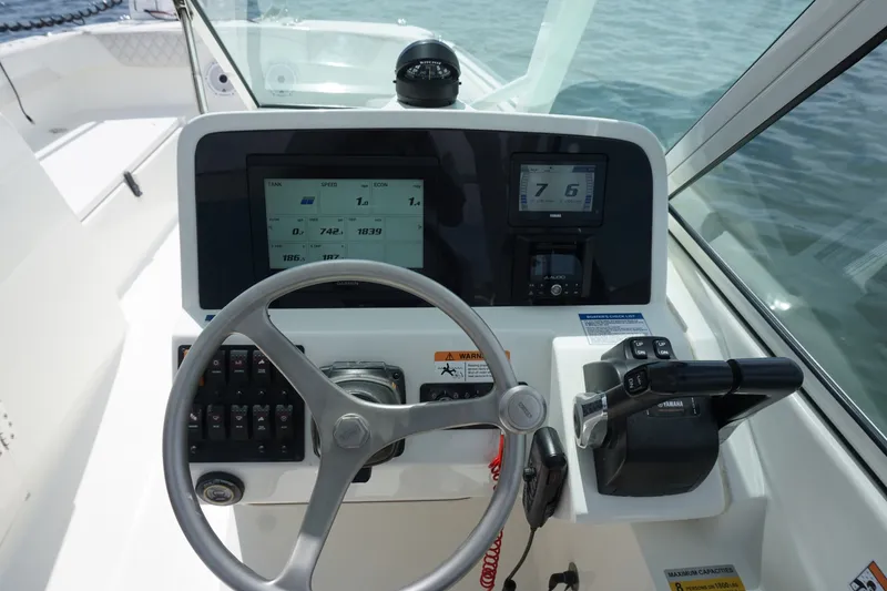 - Dual Ram Hydraulic Steering with a 15.5” Stainless Steering Wheel and Power Knob