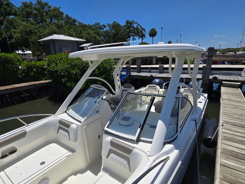 This design works well as fishermen can move quickly and easily from the front or rear cockpits. The hadrtop has rod holders and has provisions for clear weather curtains. There is a head on port side beneath the port console. It has a marine head and basin cabinet.