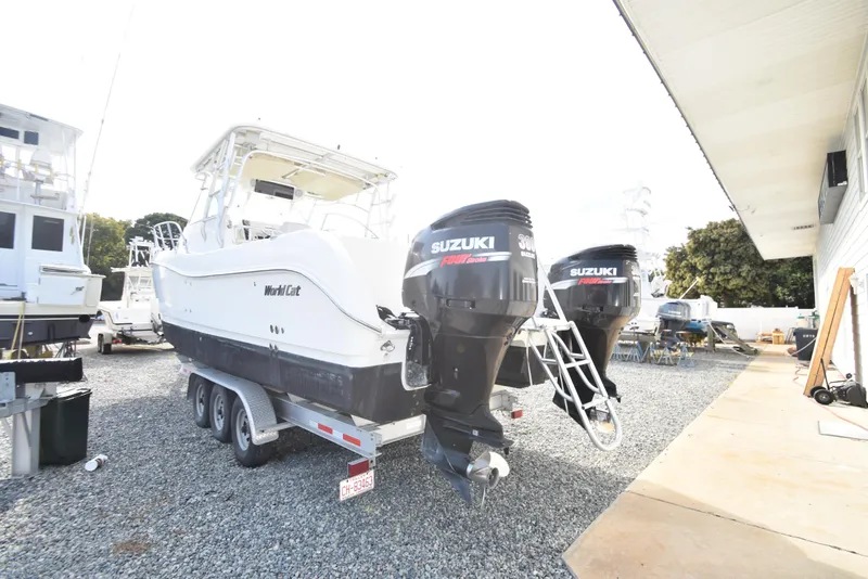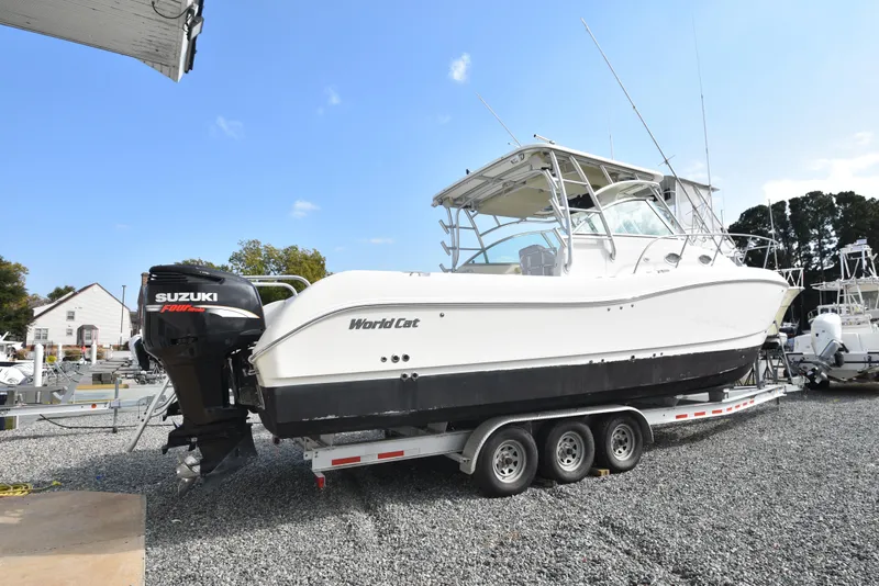With low hours on twin DF300 (300 hp) Suzuki 4 stroke outboard engines (355 hrs), Stainless steel props, Furuno NavNet3d electronics, Fischer Panda diesel powered generator, Outriggers, fishbox and tackle storage, plus the famous World Cat ride, you will find this 320 ec to be a desirable package that gives incredible value. Comfortable deep/safe cockpit depth, easy swim/dive ladder access, Safe/easy side deck access while going up to the bow, Anchor Windlass, Factory Hardtop with (4) sided helm curtains. Comfortable cabin with small galley, Double sleeping bed with surprising headroom above the bed, and overhead deck hatches. Reverse cycle Heat/Air Conditioning. Triple axle Road King trailer is included.