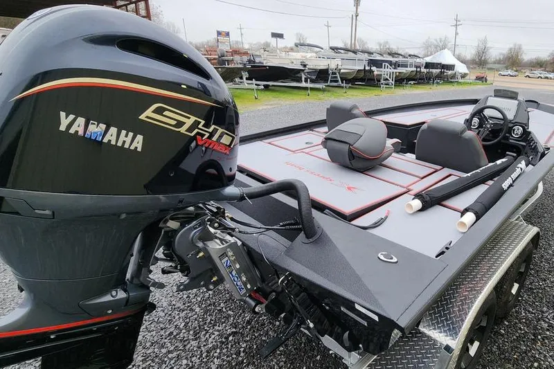 New arrival, Xpress H20Bass Powered by a Yamaha VF175-SHO, SST Prop, 6" Jack Plate, 6g wiring for trolling motor, 3-bank charger, Seastar hydraulic steering, Euro seats, Red App. Pkg, Garmin 9" at the console with the GT56UHD transducer, recirculating livewell and pump out, Aluminum wheel upgrade, and matching a spare.