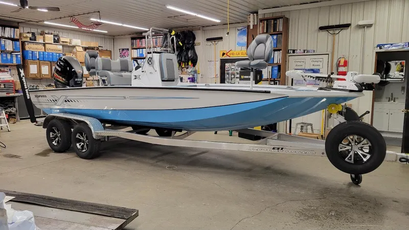 2025 H20B, 20' H Bay Center Console with Hyper Lift Hull. Bahama blue bottom/white sides, white spray in liner, gray seats. -Yamaha 150 SHO. -Custom made aluminum Tandem axle trailer with aluminum wheels, brakes on both axles, aluminum spare tire with mount, lighted logo trailer step. -Saltwater trailer package which includes Composite bunk covers, upgraded bow roller. -Xtreme Marsh package which includes. stainless rod holders, stainless cup holders, 6 stainless cleats, stainless steering wheel, stainless leaning post with backrest & footrest, two tone paint, trim on bow, 3 bank battery charger, 6 gauge wire upgrade, trim gauge, water PSI gauge, Livewell timer, auto bilge, upgraded Euro seats, upgraded dash panel w/ stainless switches. -Minn Kota Riptide Terrova,80 lb, 24 volt, I-pilot Link trolling motor. -Humminbird Xplore 9 MSI fish finder. -Ethernet cable to connect fish finder & trolling motor. -10' hydraulic jack plate. -Appearance package in Bahama blue which includes matching Seadek, seat stripes, hull side stripes. -Wet sounds radio and 4 speakers. -High Pressure wash down station. -Ladder. -Ulflex hydraulic steering. -Reinforced for T-top. -Lights in livewells, storage & interior. -Freight, prep and three 27 series batteries.F & S Yamaha and Marine1800 Smith Station RdSpring Grove, Pa 17362717-632-6382