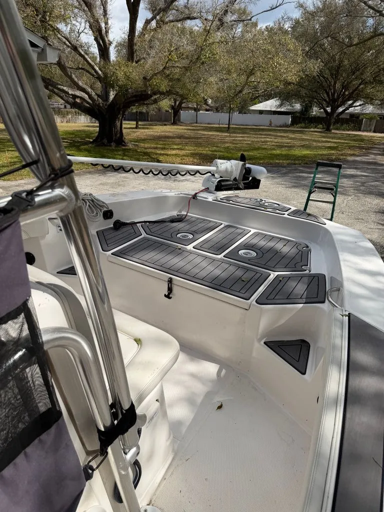 Fishing capability is significantly enhanced with a self-deploying Minn Kota Riptide Ulterra trolling motor, powered by two dedicated 12-volt batteries with quick-disconnects. A Garmin chartplotter/fishfinder and VHF radio support navigation and communication, while Sea Mats provide secure footing throughout the cockpit.