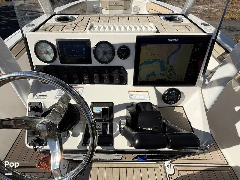Power comes from twin Yamaha TR-1 1049cc jet drives, delivering strong performance, shallow-water capability, and 360-degree fishability without outboard engines in the way. The helm is well laid out and features a large Simrad GO XSE chartplotter along with Yamaha's Connext touchscreen control system, providing intuitive access to navigation, engine data, and onboard systems. A quality marine stereo rounds out the helm electronics.