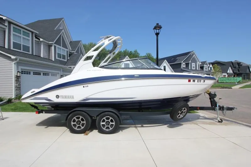 Twin 180HP/Ea High Output Yamaha's with ONLY 155 hours, cockpit cover, bimini top, foldable wakeboard tower, snap in/out cockpit woven mat flooring, Marine Fusion Stereo w/cockpit, bow, and transom speakers, transom stereo control, smartview gauges w/Touchscreen, cruise assist, drive control, 3 position "no wake control", bow ladder, cockpit table with cockpit & transom mounts, bow filler cushions, bow ladder, swim platform w/Hydrofoam flooring and fold down ladder, and a tandem axle trailer w/Disc Brakes, Spare Tire + Mount, and Swing away tongue This boat is in fantastic condition - you will not be disappointed! Call to schedule an appointment to see this beaut!
