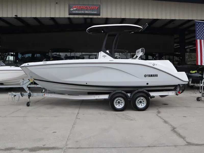 2025 Yamaha Boats 222 FSH SPORT E, The 2025 Yamaha 222 FSH Sport E Jet Boat delivers the perfect combination of cutting-edge technology, exceptional performance, and versatility, making it ideal for fishing enthusiasts, families, and watersport lovers. This innovative 22-foot jet boat is designed to elevate your on-water experiences with Yamaha's renowned reliability and superior engineering. Specifications: • Length Overall (LOA): 22' 0" • Beam: 8' 6" • Draft: 1' 7" • Weight: 3,900 lbs • Seating Capacity: 10 passengers • Fuel Capacity: 75 gallons • Engines: Twin Yamaha Marine 1.9L High Output (HO) engines • Top Speed: Up to 47 mph • Hull Type: Fiberglass, modified V-hull Power and Performance: Powered by twin Yamaha Marine 1.9L HO Engines, the 222 FSH Sport E delivers a thrilling top speed of up to 47 mph with impressive acceleration and fuel efficiency. The jet drive system ensures unmatched maneuverability and safety, with no exposed propellers, making it perfect for shallow waters and family-friendly activities. Technology and Control: The Yamaha Connext 12-inch touchscreen provides seamless control of navigation, system settings, and onboard entertainment. Advanced features like No Wake Mode and Thrust Directional Enhancer make docking and low-speed handling effortless. Fishing Features: Built for serious anglers, the 222 FSH Sport E includes a custom T-top with rocket launchers, a livewell for keeping bait fresh, and multiple rod holders throughout the boat. An integrated Garmin fish finder ensures precise navigation and fish tracking, while a spacious bow fishing platform offers comfort and ample storage for tackle and gear. Comfort and Amenities: Designed with passenger comfort in mind, the 222 FSH Sport E features ergonomic seating with flip-up bolsters, premium marine-grade upholstery, and a Fusion stereo system with Bluetooth connectivity for premium sound quality. Storage and Accessibility: Ample storage options include dedicated rod storage, under-seat compartments, and an integrated dual-level swim platform with soft EVA foam decking and a retractable ladder for easy water access. The 2025 Yamaha 222 FSH Sport E Jet Boat combines innovative features, performance, and style, making it a top choice for any on-water adventure. Contact us today to schedule a test ride or visit our showroom to explore this exceptional vessel in person.