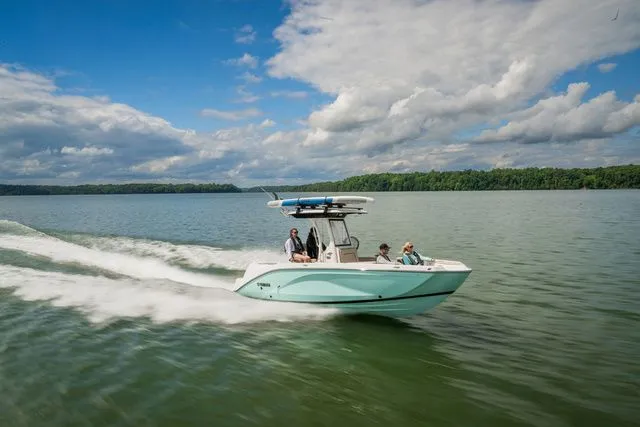 Built for fishing and fun, the 222 FSH Sport E includes a 26-gal livewell, 10 rod holders, a leaning post with tackle storage, and a tow hook for watersports. Its seafoam green or white color scheme adds a modern aesthetic, paired with an aluminum trailer for corrosion resistance.