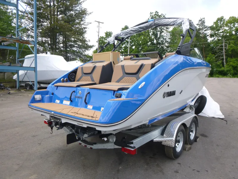The 2025 Yamaha 222XD is a 22-foot bowrider designed for watersports, particularly wakesurfing, with twin 1.9L High Output Yamaha marine engines. It features Yamaha's DRiVE technology for enhanced maneuverability and integrated WakeBoosters for creating wakes. The boat has a 70-gallon fuel capacity and can carry up to 10 people.Key Specs: