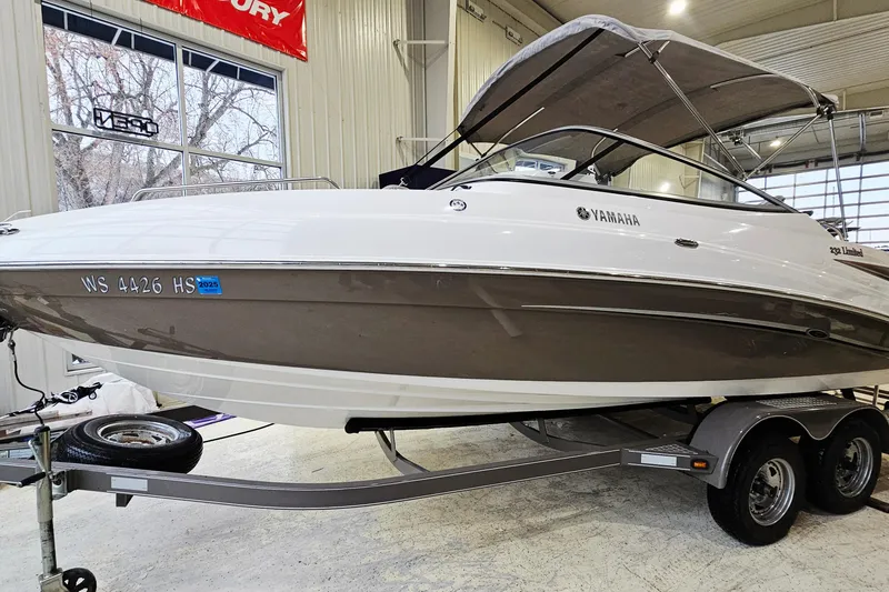 This Yamaha 232 Limited is very good looking, great eye appeal, a wonderful layout and plenty of performance for a fun day on the water! From first glance the Tan/White Color combo is appealing, the stainless accents add to the eye appeal and show the quality that Yamaha was after in the Limited model. Step onto the swim platform and Yamahas multi tiered design gets you close to the water, with comfortable cushioned backrest and foam decking. Step into the cockpit and the U Shape seating in impressive, the port side can convert into a forward facing seat, a well thought out design that adds to the versatility of the 232 Limited. The seating is deep and comfortable with nice attention to detail throughout, grab handles and cup holders are throughout the cockpit and the snap in flooring is very attractive. The oversized captains seat is noteworthy and has a flip up bolster for better visibility when needed. The helm is easy to use, a Hummingbird Helix 7 will keep you on track, tilt wheel, stereo controls and a depth finder are all nice features to have as well. The Bow Area is equally impressive as it's seating is also very deep and comfortable, the stainless grab rails are very big, the contoured seats are very nice and theirs storage under all 3 from seats. This boat is powered by the Twin Yamaha TR-1 High Output engines, they are Fuel Injected and are a perfect performer. This boat does come with a Bimini Top for those sunny days and a full cover for when the boat is not in use. The matching Shorlander Trailer makes loading and un-loading a breeze and has a folding tung for more compact storage.