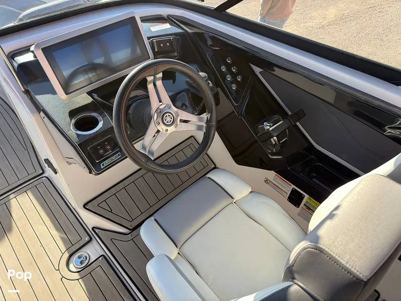 The bow area has a center cushion with beverage holders and speakers. Includes Seadek flooring on the swim platform, a tandem-axle trailer, wakeboard tower, and much more!