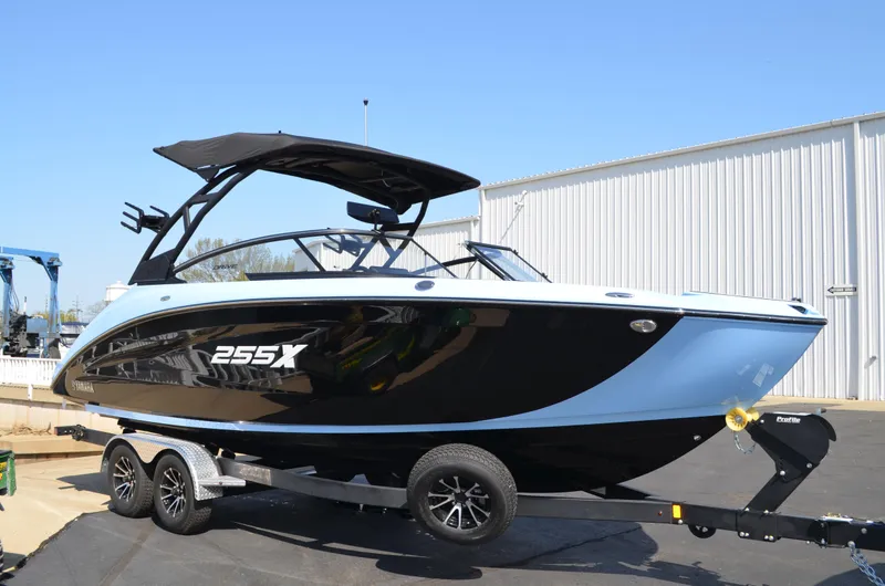 The 255 XD is powered by twin 1.8L SVHO Yamaha engines, delivering a combined 500 horsepower for exhilarating performance and wakesurf capability in a 25-foot package. With seating for up to 12, a roomy bow with backrest cushions, and a spacious cockpit, it's designed for comfort and fun. The oversized in-floor storage locker easily accommodates wakeboards and gear, while the 12.3" Connext touchscreen at the helm provides seamless control of boat systems, entertainment, and surf settings. A custom-painted trailer ensures this jet boat stands out on both water and land.
