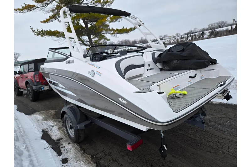 Nice 2023 Yamaha AR195 comes with: 250 hp Yamaha 1.8L Jet Drive with ONLY 54 Hours, Custom Cover, Bimini Top, snap matting, tilt wheel, large in-floor storage, bow filler cushion, and much more!