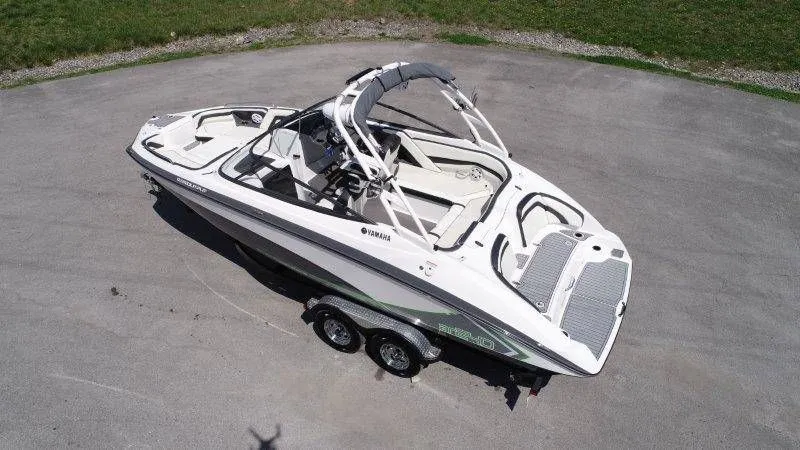 2016 Yamaha AR 240, 2016 Yamaha AR240 Twin Yamaha 1.8L Marine 175 hours Tandem Axle Trailer with Swing tongue & Spare Water Sports Tower with tower speakers & Bimini top Adjustable Captain's Chair with Flip-up Bolster Passenger-side Captain's Chair Portside Entertainment Area with Lockable Glovebox Glove Box Integrated Removable Cooler Area Walk-through Bow Door Enclosed Head Compartment Tilt Steering Courtesy Deck Lighting Dedicated Anchor and Rope Locker Bow Reboarding Ladder Bow Filler Cushion In floor Storage Snap in/out Carpet Integrated Swim Platform Upholstered Cushioned Backrests Additional Wet Storage Behind Backrests with 12-volt Outlet Stainless Steel Telescopic Reboarding Ladder Full Mooring Cover 12 Passenger Capacity 50 Gallon Fuel Tank