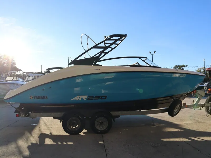 2023 Yamaha Boats AR250, USED 2023 YAMAHA BOATS AR250 | TWIN YAMAHA 1.8 L HIGH OUTPUT ENGINES | BLUE TRAILER UPGRADE The 2023 Yamaha AR250 isn't just a boat-it's a full-on watersports machine. Powered by twin 1.8 L High Output Yamaha marine engines, this 24-6" hull delivers strong acceleration, smooth jet-powered handling, and maximum versatility across tubing, wakeboarding and cruising. With Yamaha's clean-out ports and jet drive design, it offers superb shallow-water access and trouble-free performance. LAYOUT & COMFORT Inside, the AR250 is designed for everyday family use and premium enjoyment. The deep freeboard, wraparound seating for up to 12 persons, and expansive bow filler cushions give you a comfortable lounge zone for everyone. A floating-helm design puts you in command, while the swim platform with cushioned backrests and telescoping ladder offers an effortless transition to relaxation. FEATURES Twin 1.8 L High Output Yamaha engines (≈180 hp each) giving approx. 360 hp total. 75-gallon fuel tank for extended outings. Forward-swept aluminum wakeboard tower with board racks and integrated tow point. Snap-in marine-grade flooring, premium upholstery and built-in storage throughout. TECHNOLOGY At the helm of the AR250, Yamaha's Connext touchscreen system gives you full control of navigation, ballast/wake settings (when equipped), audio and engine data. The intuitive joystick and ergonomically positioned controls keep everything at your fingertips for an elevated drive experience. SAFETY With its jet propulsion system, the AR250 removes the risk of exposed propellers and excels in shallow water conditions. Non-skid surfaces, thoughtful grab-rail placement, high freeboard and a dual-engine setup add layers of security for the whole crew. SPECIFICATIONS Length: 24' 6" (294") Beam: 8' 6" Draft: 19" Dry Weight: Approx. 4,034 lbs Fuel Capacity: 75 gallons Passenger Capacity: 12 persons Engines: Twin Yamaha 1.8 L High Output Marine Engines (~180 hp each) Boating season is still in full swing, and best spent on a boat from VForce Marine - Your Marine Superstore.