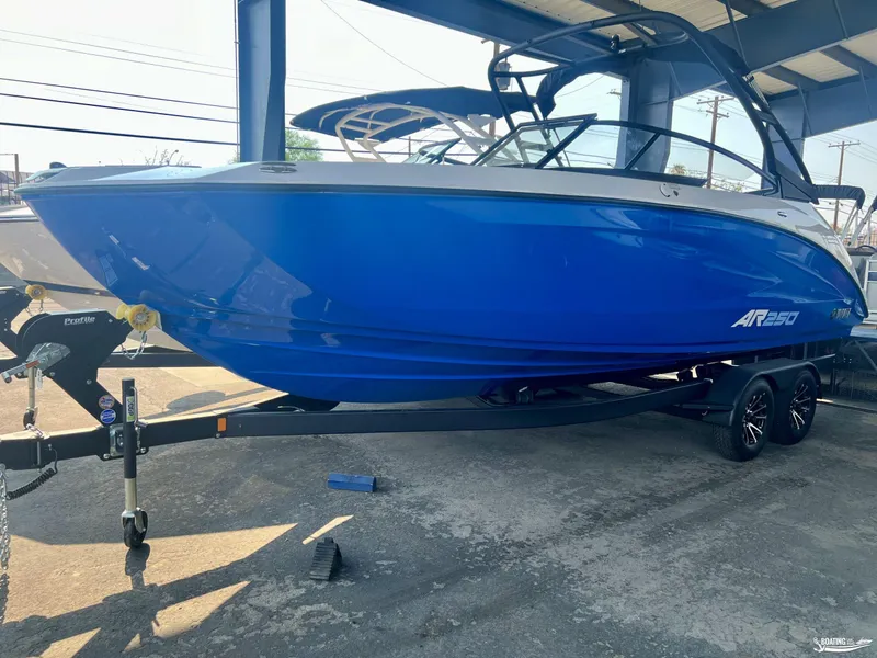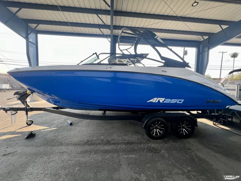 The 2025 Yamaha Boats AR250, featuring a stunning blue finish, is a top-tier jet boat designed for both performance and comfort. Powered by twin Yamaha 4-stroke, 1.9L engines, this 25-foot vessel delivers exhilarating acceleration and impressive top speeds, making it perfect for watersports and leisurely cruising.