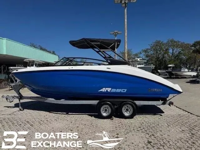 2025 Yamaha Boats AR250, End of season Blow Out! Snap-in Marine-Grade Woven Floor Mat Ski Locker Removable Dinette Table with Pedestal Bow Filler Inserts for Multiple Seating Configurations Hinged Seat Cushions Tilt Steering Adjustable Captain's Chair with Flip-up Bolster Passenger-Side Captain's Chair Portside Entertainment Area Glove Box Walk-Through Bow Door Integrated Removable Cooler Enclosed Head Compartment Courtesy Deck Lighting Dedicated Anchor and Rope Locker Bow Reboarding Ladder Upgraded Aluminum Handles & Accents Cockpit Drainage System (CDS) Integrated Drink Holders Integrated Swim Platform Upholstered Cushioned Backrests 12-Volt Outlet Stainless Steel Telescopic Reboarding Ladder Dinette Table Mount Marine-Grade Mat Stern (Wet) Storage Connext with Touchscreen Custom Fit Smartphone Holder Boat Wellness Function Display Marine Stereo Wireless Charging Points AUX Bluetooth Capability USB Charge Ports 12V Outlet Marine Speakers Stern Stereo Remote Stern Speakers 3 Position "No Wake Mode" Control Cruise Assist Compass Depth Finder Water Temperature Electronic Speedometer Fuel Management System Dual Battery Setup Rack & Pinion Steering Quiet Cruise Technology Articulating Keel System Yamaha Marine Engine Twin 4-Cylinder, 4-Stroke, 1.9 Liter High Output Yamaha Marine Engines Stainless Steel Bow Rails Stainless Steel Cleats Tow Hook Bimini Top Aluminum Folding Wakeboard Tower with Tow Hook Windshield Mirror Painted Trailer with Swing-Away Tongue Spare Tire and Mount Disk Brakes Chrome Wheels & Aluminum Fender Step Plates Lights Safety Chains Adjustable Winch Stand with Strap and Hook