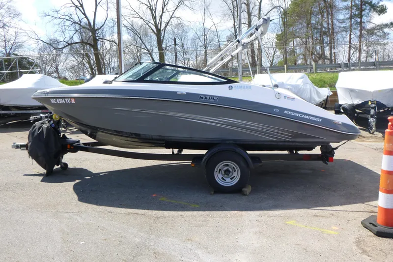 The 2015 Yamaha SX192 is a 19-foot 2-inch, 2,150 lb jet boat powered by a 210 hp Super High Output (SHO) 1.8L supercharged engine, capable of top speeds near 50 mph. It features a 30-gallon fuel capacity, 8-person seating capacity, and a 12.8-inch draft. Standard features include a two-tiered swim platform, Bimini top, and a single-axle trailer. [1, 2, 3, 4, 5, 6, 7] Key 2015 Yamaha SX192 Specifications- Engine: Single 1.8 Liter Super High Output (SHO) Yamaha Marine Engine (Supercharged).