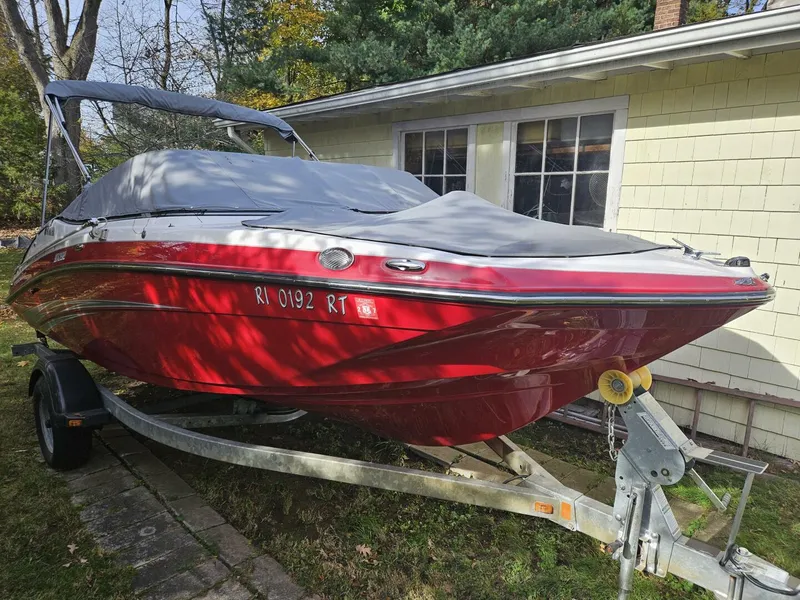 The SX 192 is 19' 2" long, has a beam of 8' and has a bridge clearance of 3.4'. The draft is 12.8". The weight of the boat is 2150 pounds. The fuel capacity is 30 gallons. The boat features a two-tiered swim platform. Options include a Bimini top, a Clarion stereo, Standard Horizon VHF radio, canvas covers for the front seating area as well as for the entire cockpit. Included with the boat is a single axle bunk trailer. The manufacturer recommends no more than eight passengers.