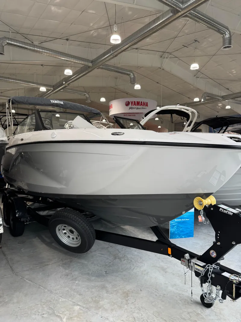 **the Dealership is not Responsible for any Errors or Omissions Made in the List of Standard Features.**, Snap-in Marine-Grade Woven Floor Mat, Ski Locker, Removable Dinette Table with Pedestal, Bow Filler Inserts for Multiple Seating Configurations, Hinged Seat Cushions, Tilt Steering, Adjustable Captain's Chair with Flip-up Bolster, Passenger-Side Captain's Chair, Portside Entertainment Area, Walk-Through Bow Door, Integrated Removable Cooler, Courtesy Deck Lighting, Dedicated Anchor and Rope Locker, Bow Reboarding Ladder, Cockpit Drainage System (CDS), Integrated Drink Holders, Integrated Swim Platform, Upholstered Cushioned Backrests, Stainless Steel Telescopic Reboarding Ladder, Marine-Grade Mat, Stern (Wet) Storage, Connext with Touchscreen, Custom Fit Smartphone Holder, Boat Wellness Function Display, Helm Switch Panels, Marine Stereo, Wireless Charging Points, AUX, Bluetooth Capability, USB Charge Ports, 12V Outlet, Marine Speakers, 3 Position "No Wake Mode™" Control, Cruise Assist, Compass, Depth Finder, Water Temperature, Electronic Speedometer, Fuel Management System, Rack & Pinion Steering, Quiet Cruise Technology, Articulating Keel System, Yamaha Marine Engine, Twin 3-Cylinder, 4-Stroke TR-1 Yamaha Marine Engines, Stainless Steel Bow Rails, Stainless Steel Cleats, Tow Hook, Bimini™ Top, Windshield Mirror, Painted Trailer with Swing-Away Tongue, Spare Tire and Mount, Disk Brakes, Chrome Wheels & Aluminum Fender Step Plates, Lights, Safety Chains, Adjustable Winch Stand with Strap and HookWith its roomy cockpit, abundant storage, and fuel-efficient dual engines, this boat offers exceptional value and versatility, all at an affordable price.