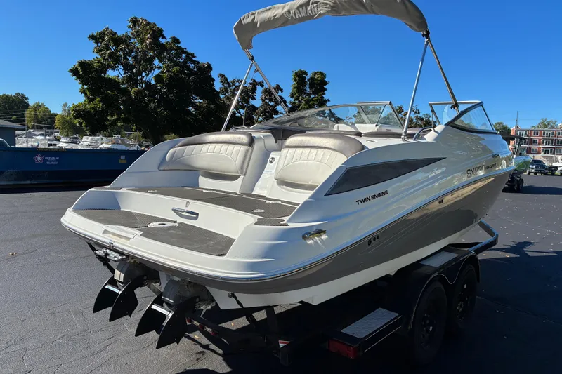 This sweet Yamaha SX 230 with twin 140 hp jet drives is guaranteed fun for the family! Ski, tube, and cruise in the river or on the Big Lake with your friends and family! This boat appears to have lived a cushy fresh-water life and it shows. The upholstery, canvas, and cockpit carpet are in excellent condition and entire boat shows pride of ownership. Includes the following options and features below: