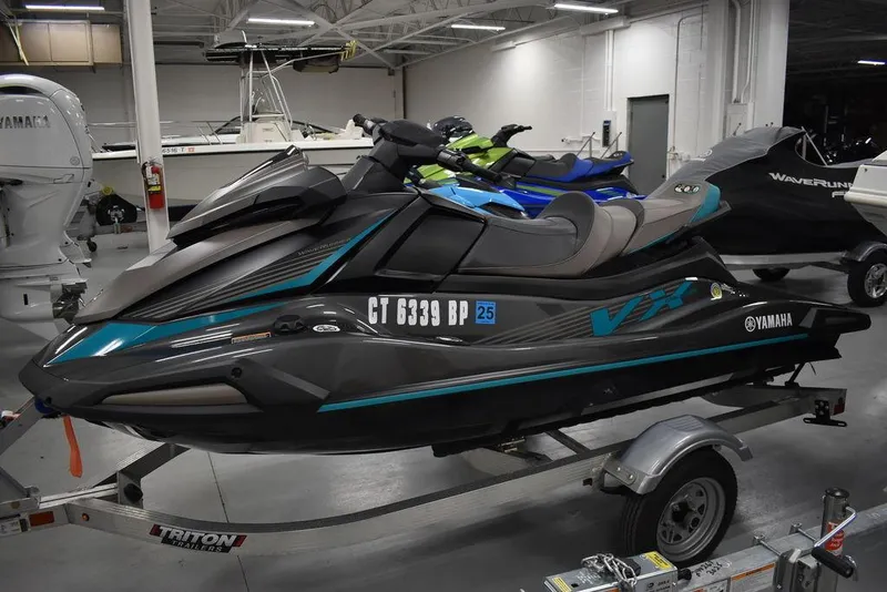 For sale by Diamond Marine of Connecticut, a 2023 Yamaha Waverunner VX Cruiser with 2024 Triton Aluminum trailer. Only 2.5 hours of use and transferable warranty good till 7/14/2028. Included is a factory cover, two life jackets and fire extinguisher. Features include a 4.3 inch systems screen with security lockout PIN, Cruise assist/No wake, Dual mirrors, Cruiser seat, Pull up cleats and upgraded reboarding step. Like buying new without the price tag. Financing available, local trades welcome. Contact us today by email or phone and ask for Mark or Karl. Thank You, Diamond Marine, a Yamaha waverunner dealer.