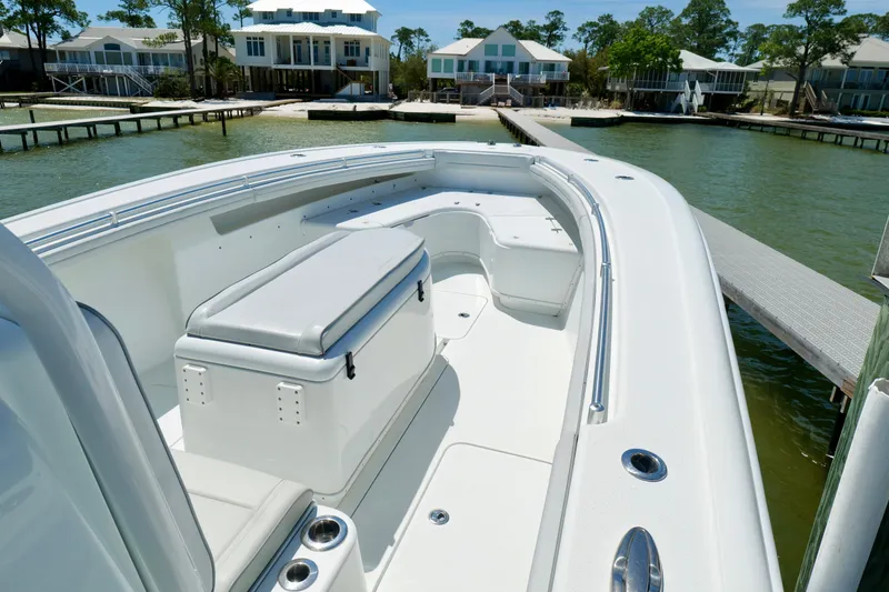 Spacious Layout: The boat features ample deck space with well-thought-out fishing amenities, including rod holders, live wells, and storage compartments, enhancing the angler’s experience.