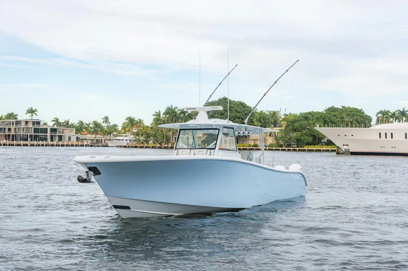 This Custom-Built 42' Yellowfin Yacht Tender 2023 is an absolute rocket-hitting speeds up to 74 mph. She keeps up, to say the least. Loaded with performance and comfort features, she includes a Quick Stabilizer, Frigibar Ice Machinefeeding the fishbox, no bottom paint, Garmin electronics, dual-row seating, Dive Door, Bow Thruster, forward lounge and seating, sink and cooler in the leaning post, double berth, Air Conditioning, and quad Mercury 450Rs with low hours.