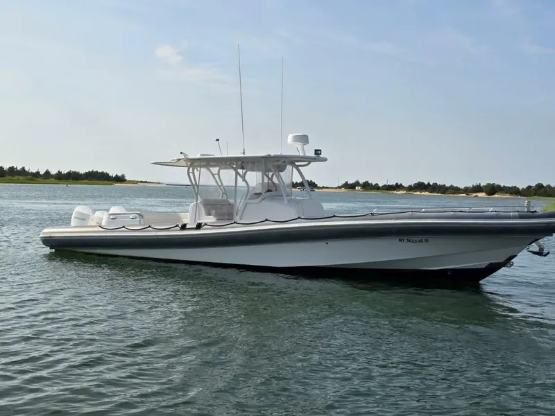 The 40' Yellowfin RIB is a high-performance, custom superyacht tender blending sportfish DNA with luxury tender functionality. Built in Sarasota FL and launched in 2015. It is currently located in East Hampton, NY. The layout is a center console design with a T top and a head under the console. There is seating in front of the console that opens up and allows access to the head which has good head room. A live well is located behind the helm seats which is hidden under a seat . There is U shaped seating in the back and V shaped seating in the front, with retractable backrests. It has the option for aft and forward tables that slot into the deck. A forward deck locker that allows good storage for lines and fenders. The forward and aft seating also has storage under the seats. An aft deck hatch gives access to the bilge pumps, racors, holding tank, macerator pump, live well pump, hydraulic steering pump, hydraulic trim tabs, drain plug. There are 6 cup holders, 5 rod holders and scuba tank holders for 8 dive tanks.