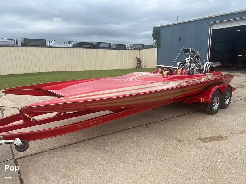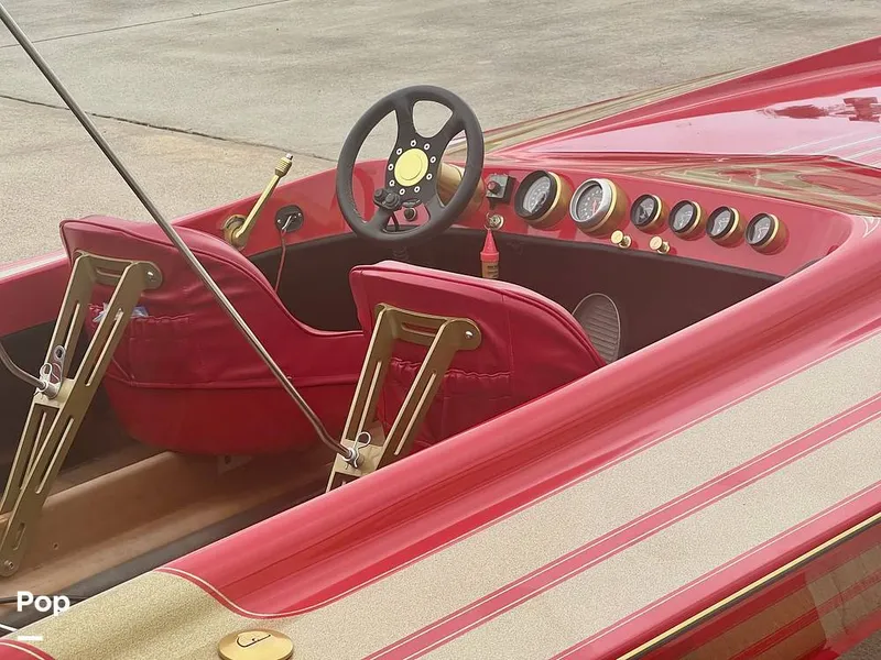 This sleek boat, measuring 21 feet, captures attention with its streamlined silhouette, brilliant red and gold paint scheme, and vibrant graphics that evoke the spirit of racing.