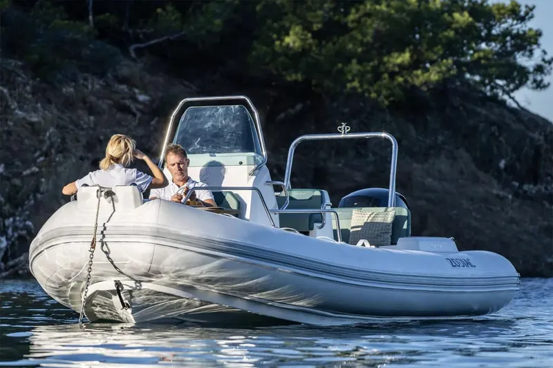 The Zodiac Medline 5.8 is a versatile 19-foot rigid inflatable boat (RIB) designed for family cruising, sandbar days, and watersports, combining premium comfort with proven offshore performance. Built with Zodiac's renowned deep-V fiberglass hull and durable Hypalon tubes, the Medline 5.8 delivers a smooth, dry ride while maintaining excellent stability and fuel efficiency.