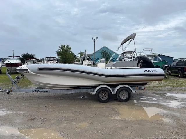 This impressive Zodiac is equipped with Mercury 150 hp outboard engine with 407 hours of use. It offers an array of excellent features and delivers exceptional handling on the water. The boat is fitted with comfortable cushioned seating from bow to stern and includes a sun lounge at the front of the boat. Ample storage is available throughout the vessel, including a spacious storage locker at the bow. The helm seat lifts to a convenient sink and cutting board, perfect for picnics on water. With plenty of space for family and friends, this ensures a pleasant and enjoyable experience. The ribbed design facilitates boarding and protects the sides of the boat from docks other vessels. This unique and enjoyable boat is currently listed by Grand Strand Boat Sales, at 3508 Hwy 9 East, Little River, South Carolina, 29566. For inquiries to schedule a viewing, please contact Wilson.